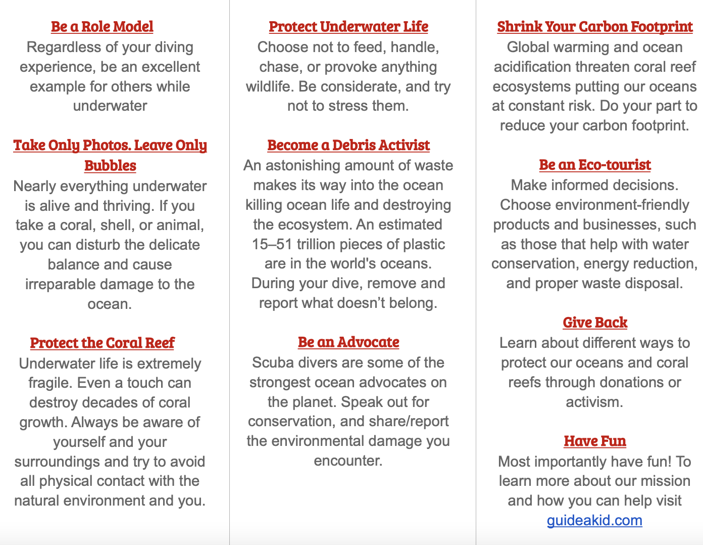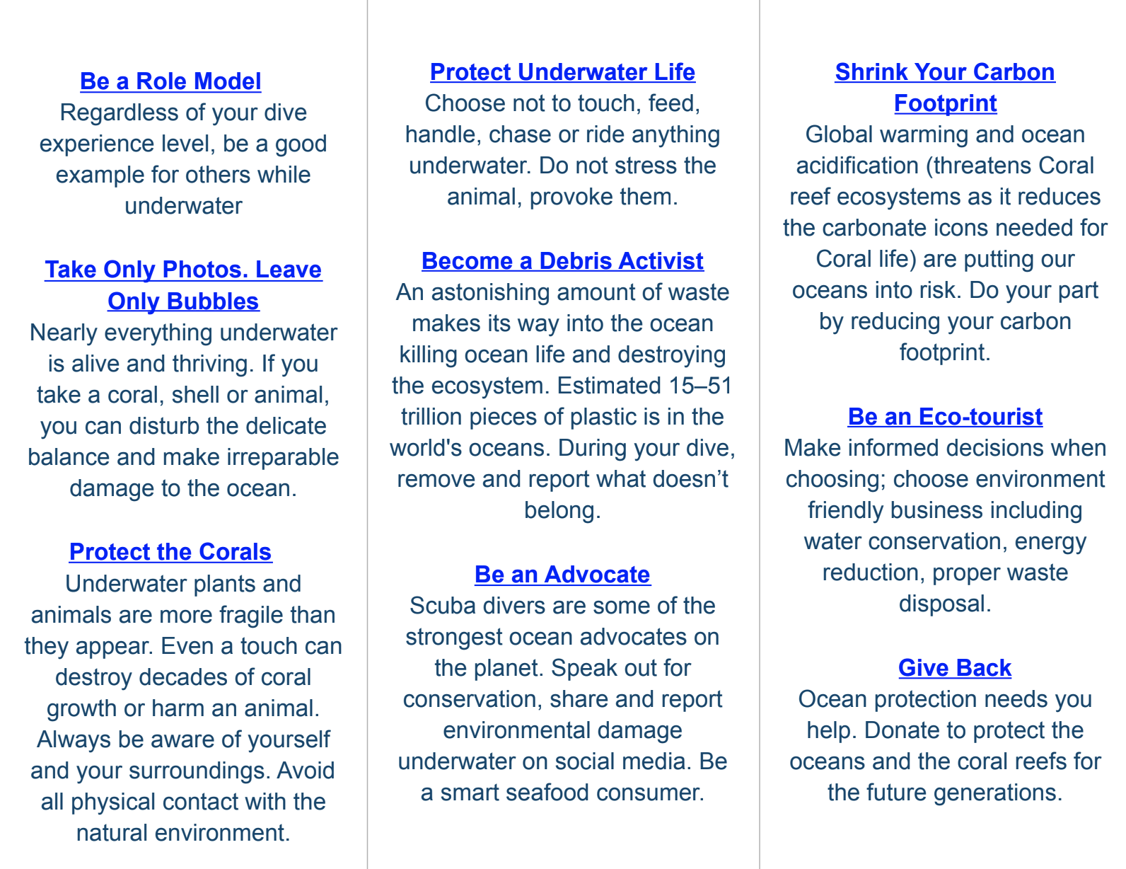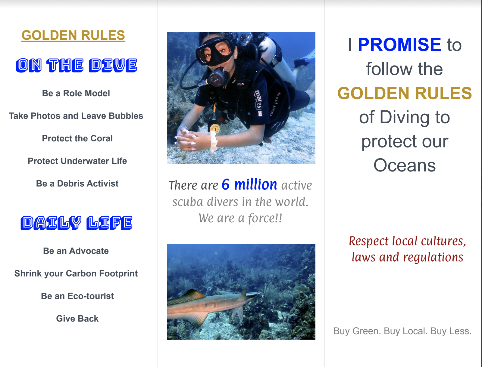 In an effort to help preserve the ocean and marine life in the Bay Islands of Honduras, we created pamphlets. These pamphlets aim to raise awareness for visiting tourists on the DOs and DON’Ts when diving or snorkeling. We realized that many dive centers on the island verbally explained these rules but did not list them out for people to recheck and completely understand. With these pamphlets, tourists are able to read and re-read the “Golden Rules.”