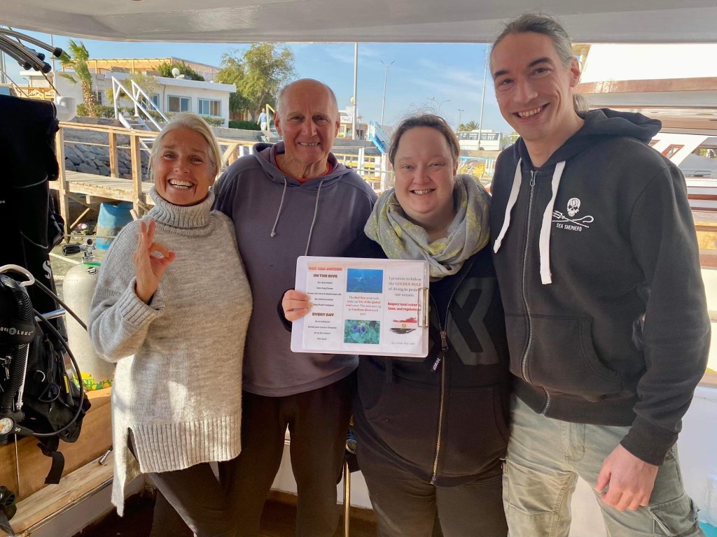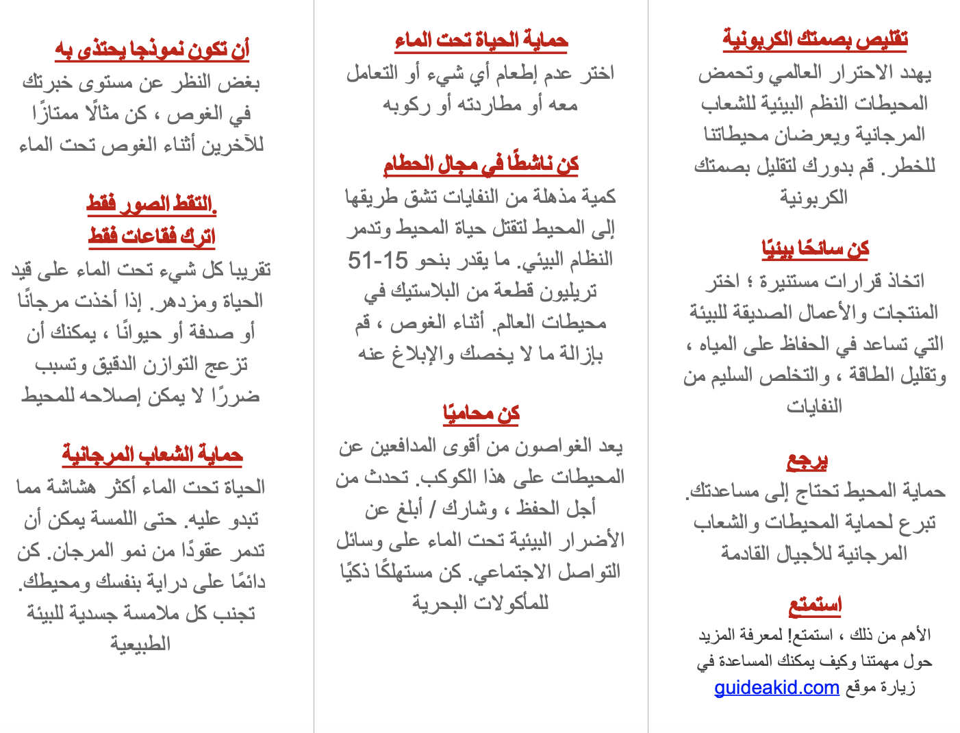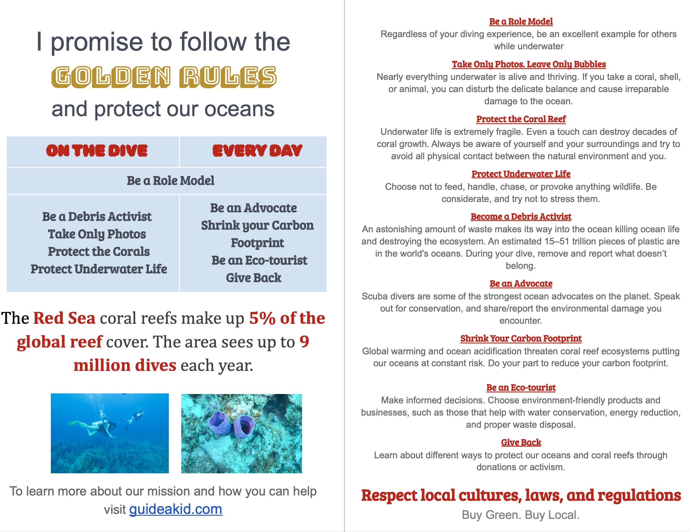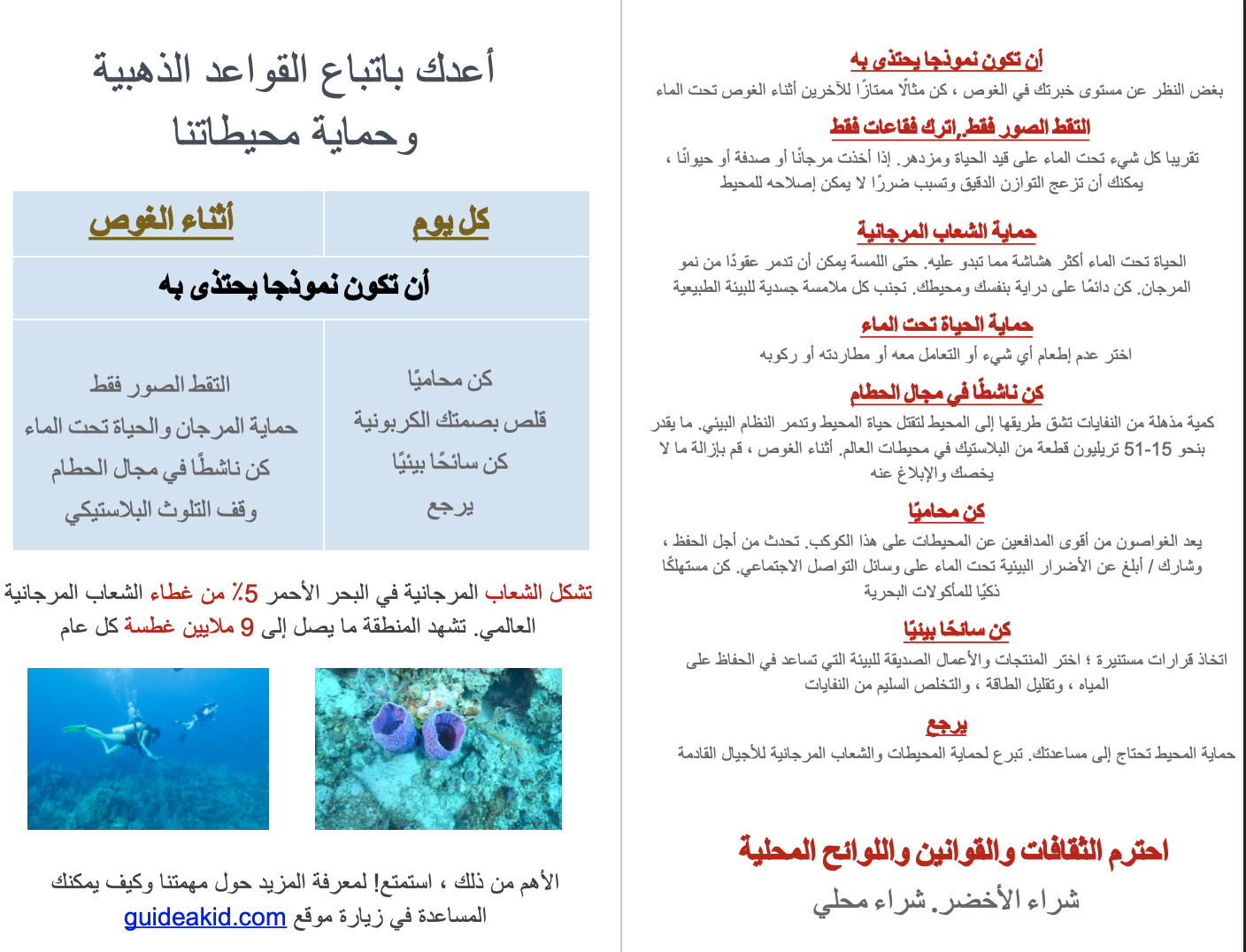 In another effort to help preserve the ocean and marine life in the town of Hurghada, Egypt, we created pamphlets in Arabic and English, and distributed a laminated copy to a dive-center.