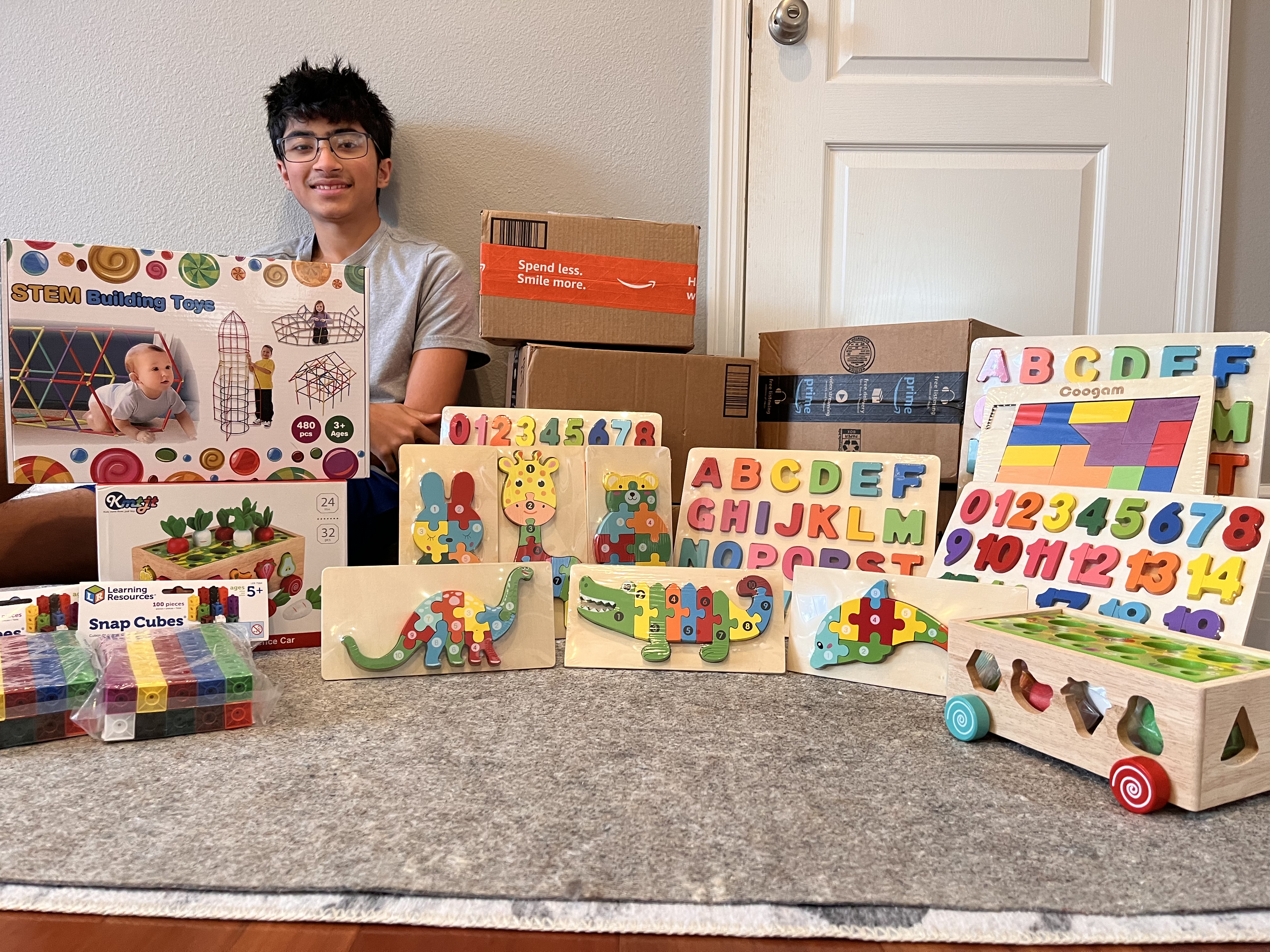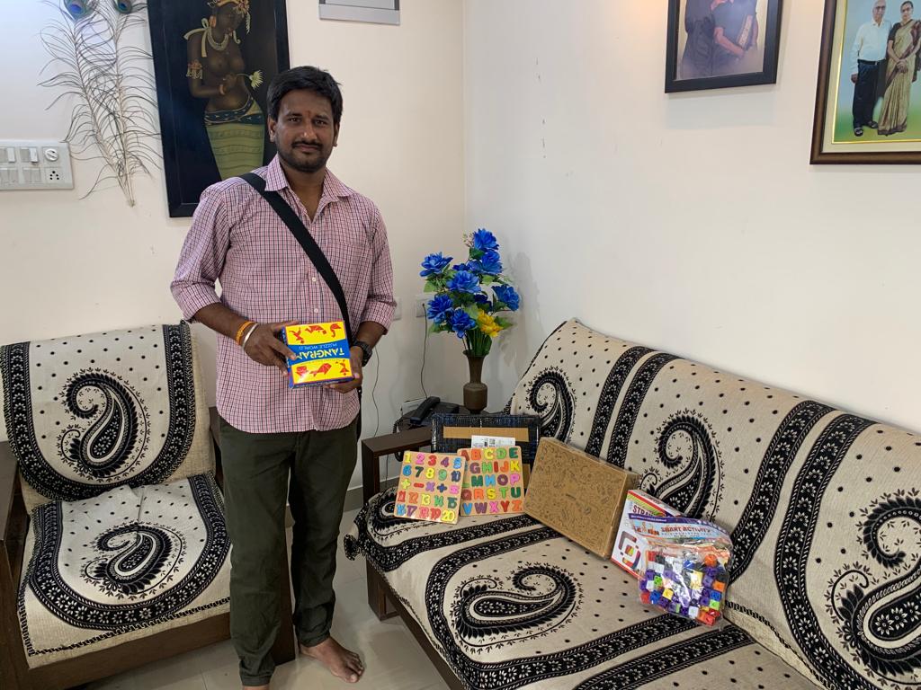 Donated STEM kits to governmental schools in Telangana, India. The STEM kits include tangrams, number and letter puzzles, snap cubes, and more.